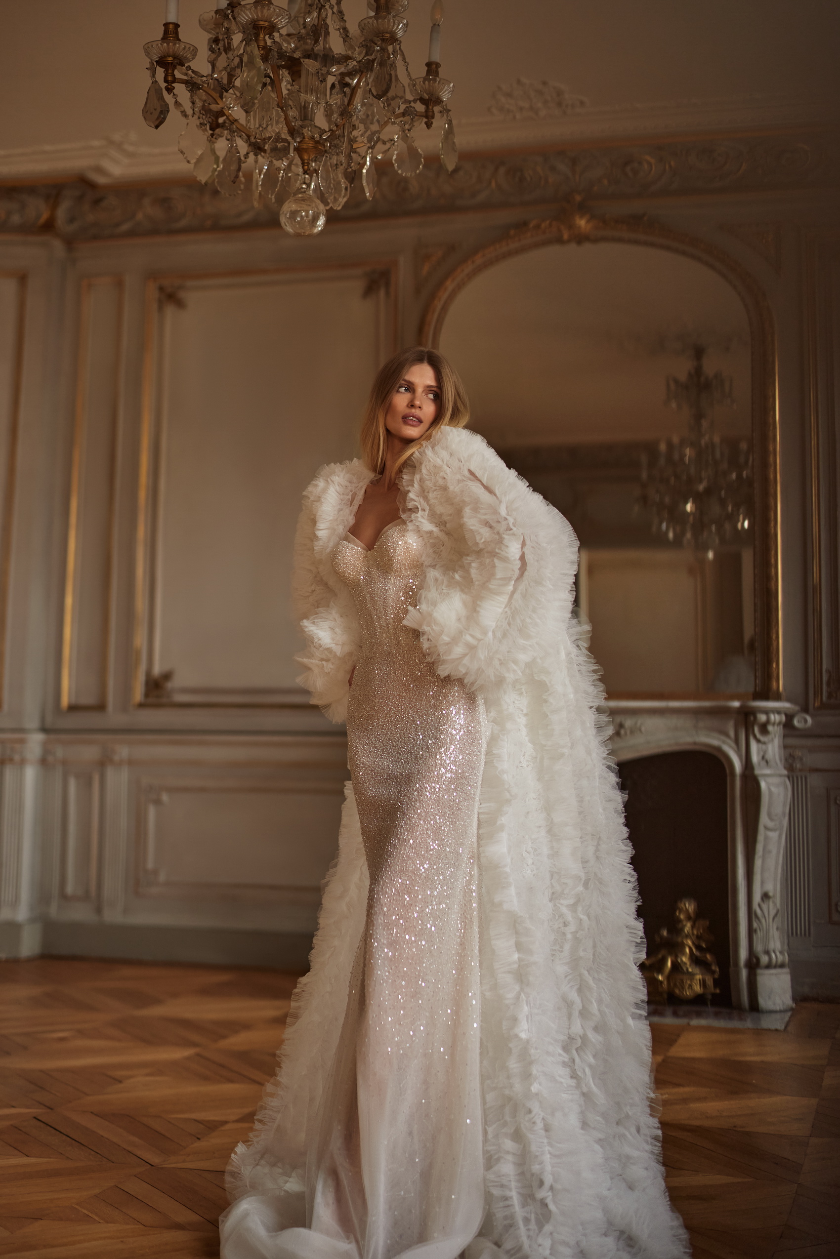 An elegant fitted gown is made from lace that is embroidered with sequins. The striking neckline is complemented by sculptural inserts. The semi-transparent skirt features a small train. The gown has a zipper and internal loops. The look can be styled with multiple capes. The first is a voluminous short taffeta cape. The second is a long-sleeved option, embellished with pleated ruffles.