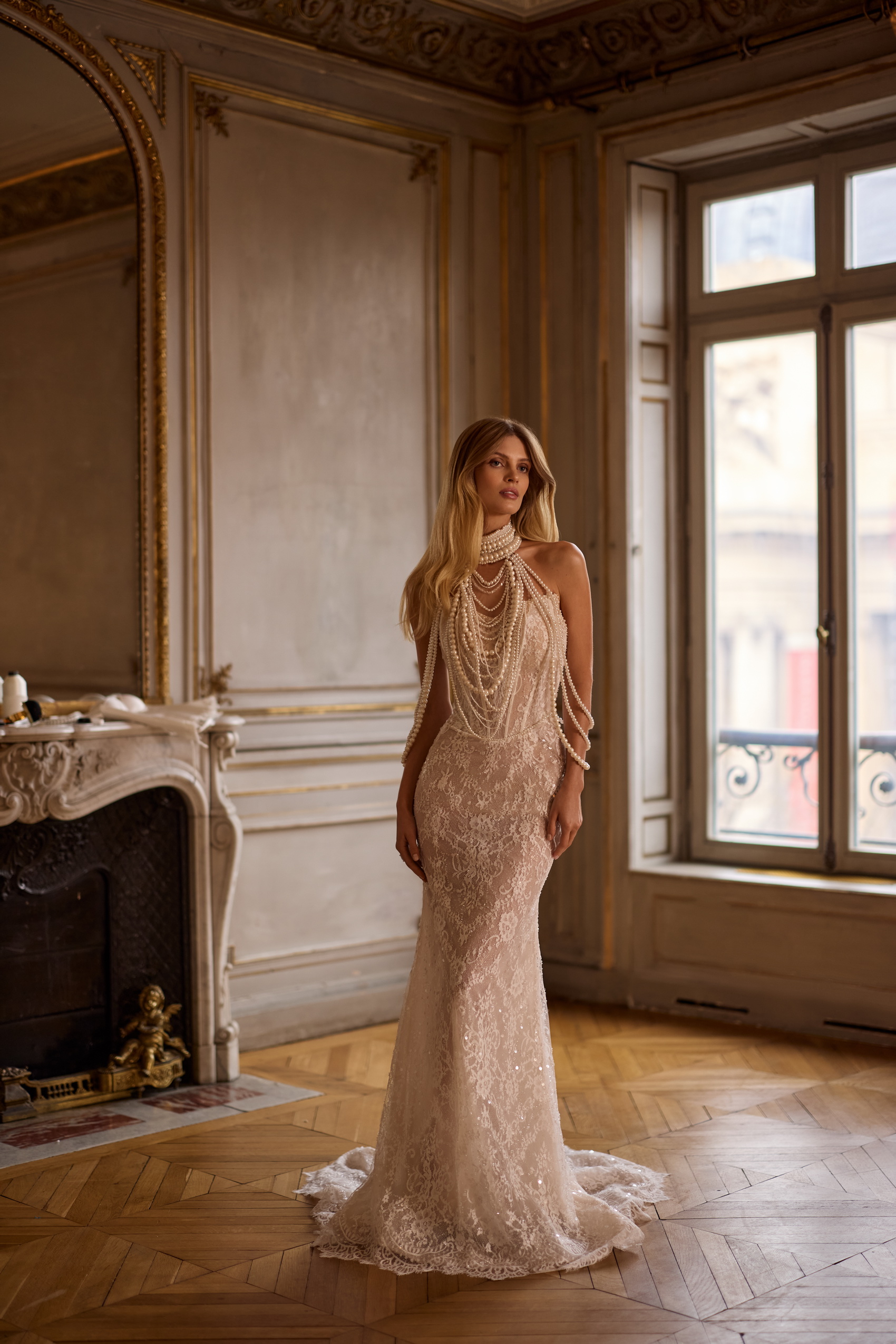 A magnificent mermaid gown is made from Chantilly lace, that is manually embroidered with beads, sequins, and pearls. The sculpted bodice is complemented by vertical lines and pearl embroidery. There is a zipper at the back. The semi-transparent skirt flows into a small train. The look can be completed with a splendid pearl choker that elegantly cascades over the dress.