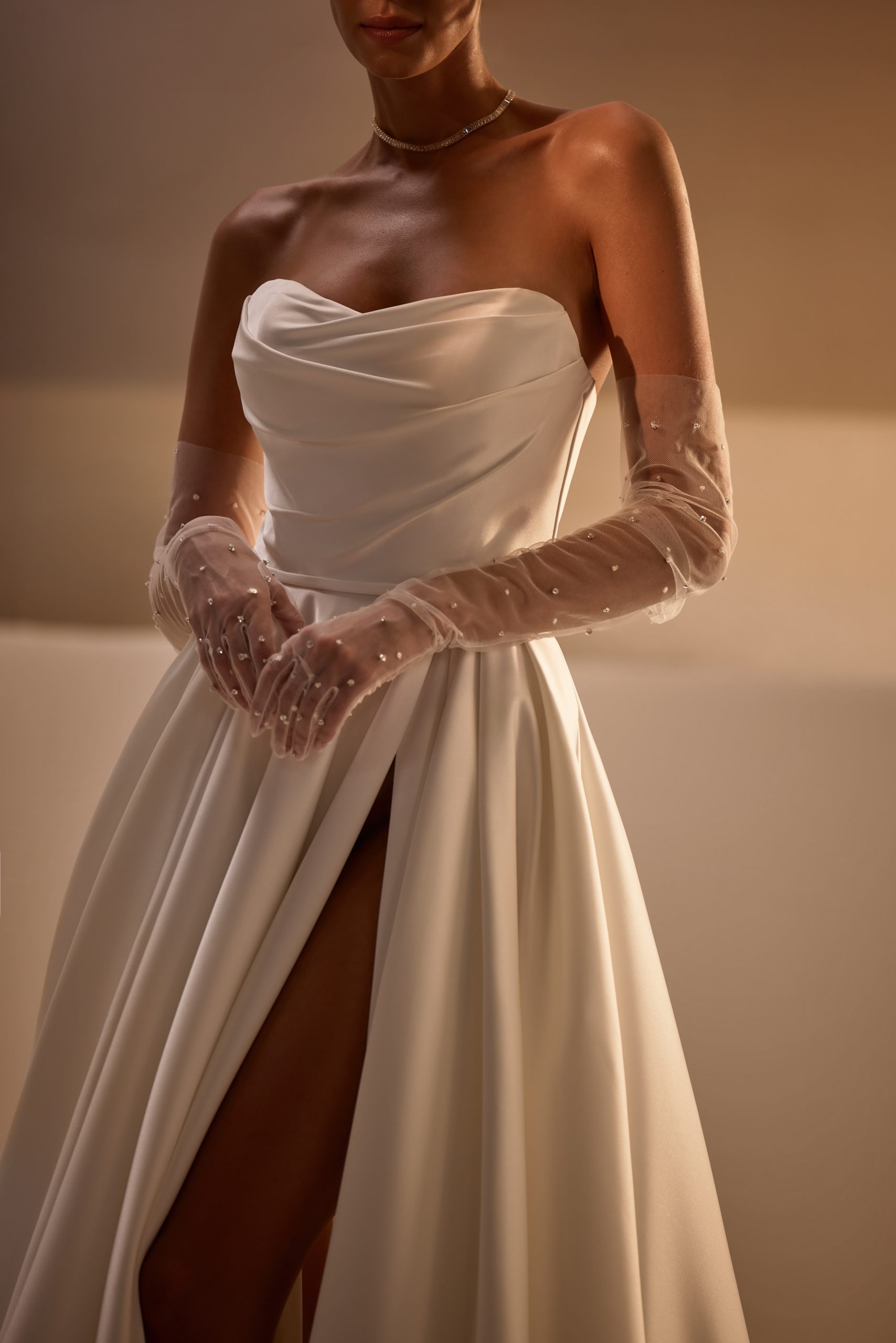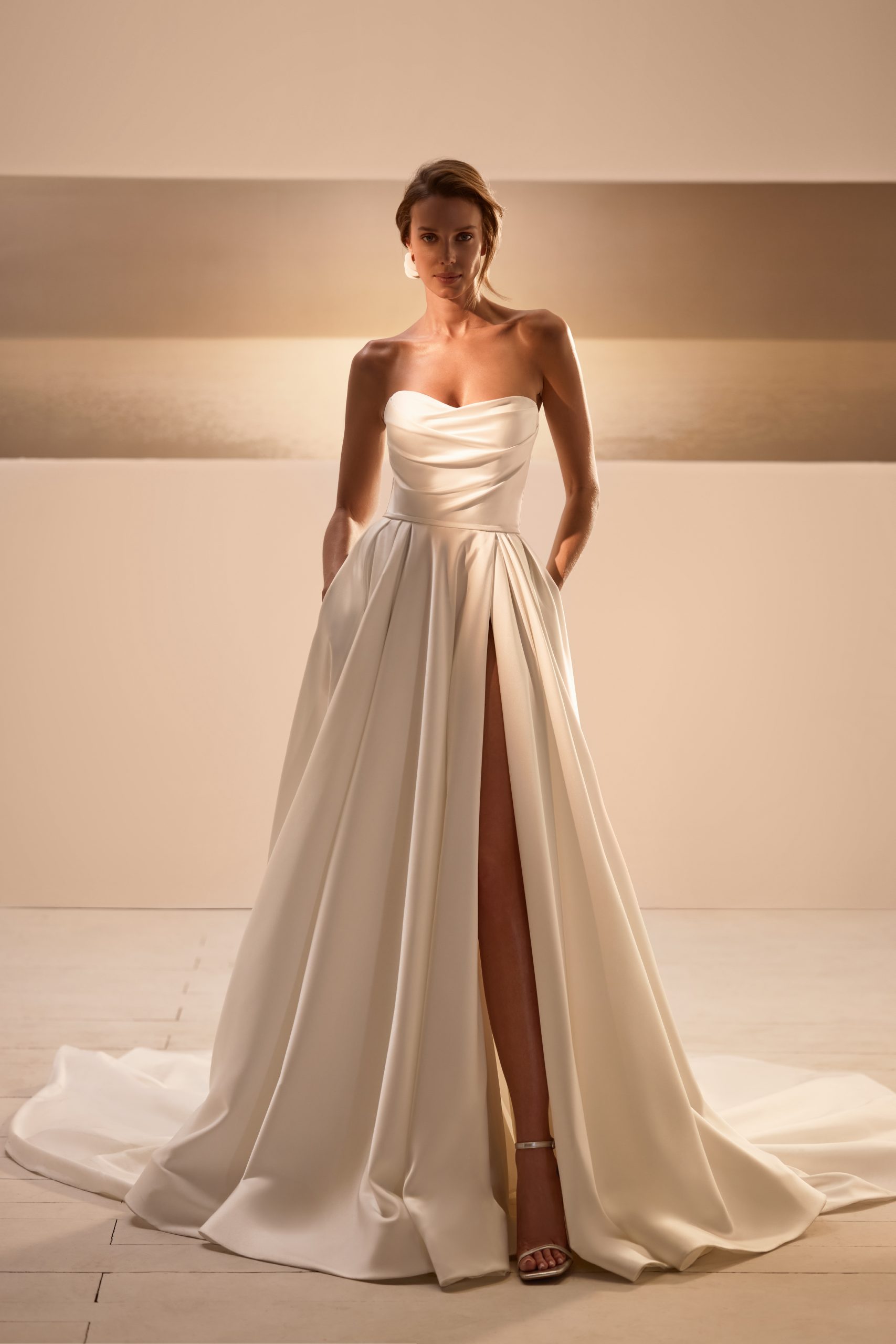 A romantic A-line gown is made of ivory stretch satin. The off-the-shoulder bodice features a sweetheart neckline with draping. There is a zipper and an internal lacing. A thin belt accentuates the waistline. The wrap-around dress with pleats includes pockets and a high slit. There is a long train. The look can be embellished with a detachable wrap and gloves. The wrap is made of voluminous mesh and adorned with feathers. The gloves are made of mesh and embellished with sparklers.
