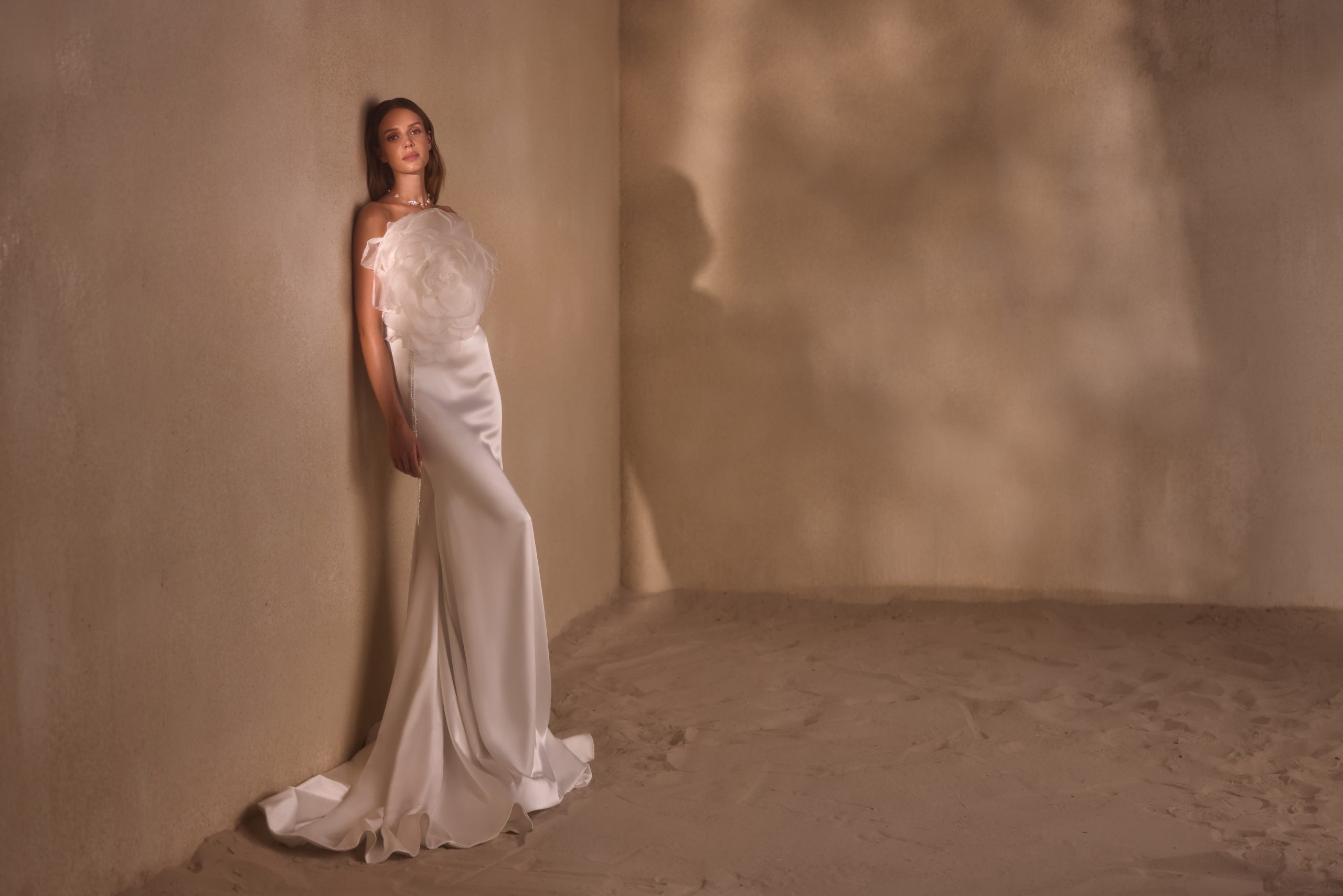 A laconic fitted dress is made of satin. The bodice is adorned with a handcrafted organza flower and features airy straps that are made of pearls and beads. There is a zipper closure and internal lacing at the back. A belt with pearls and beads emphasizes the waistline. The skirt emphasizes the figure and flows smoothly into a train.