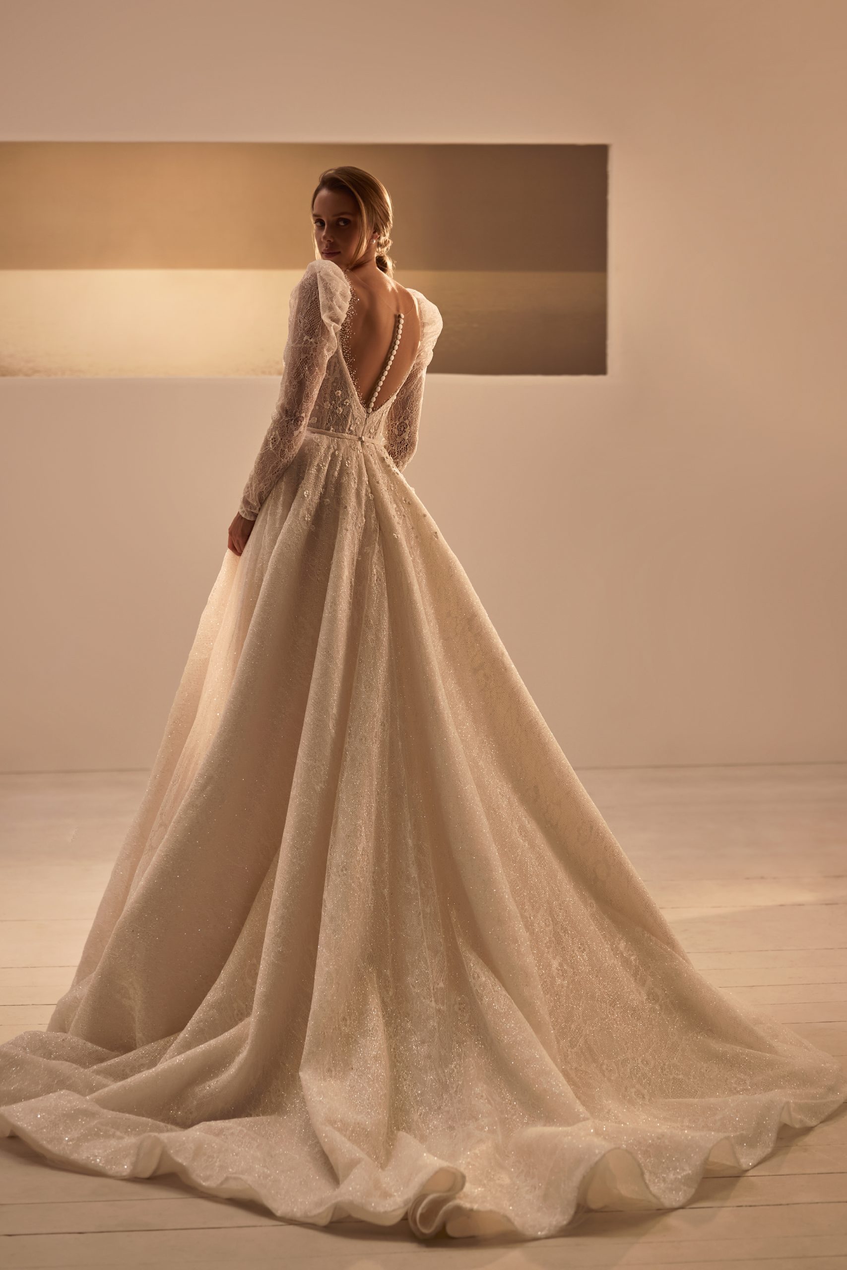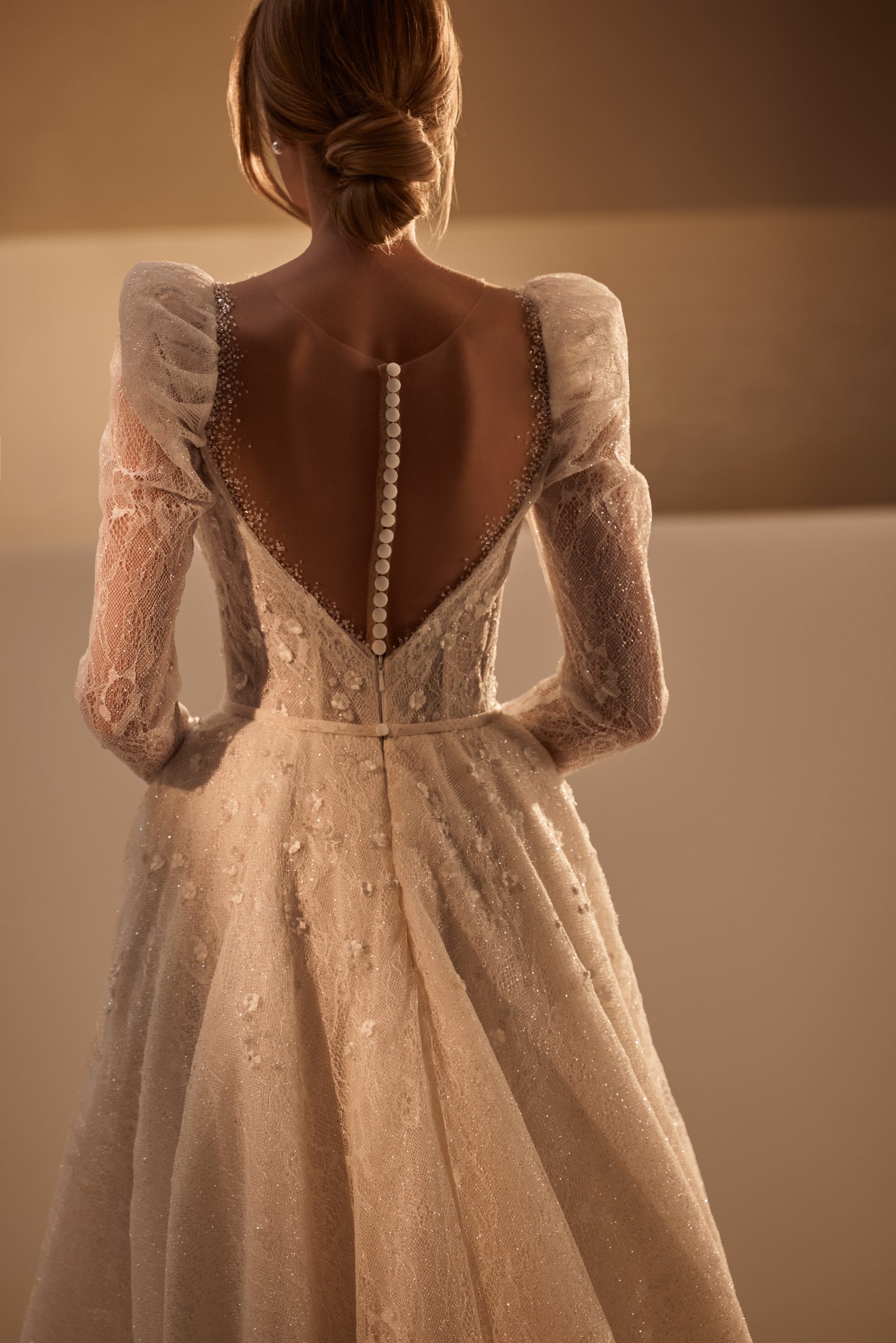 Un romántico vestido en línea A está confeccionado en encaje Chantilly y satén nude. El corsé con un escote profundo está decorado con drapeados, flores voluminosas y bordado de perlas y cuentas. Las largas y voluminosas mangas están hechas de encaje Chantilly. La parte posterior es abierta y tiene botones. Un delgado cinturón acentúa la cintura, y la falda con pliegues fluye suavemente hacia una cola.