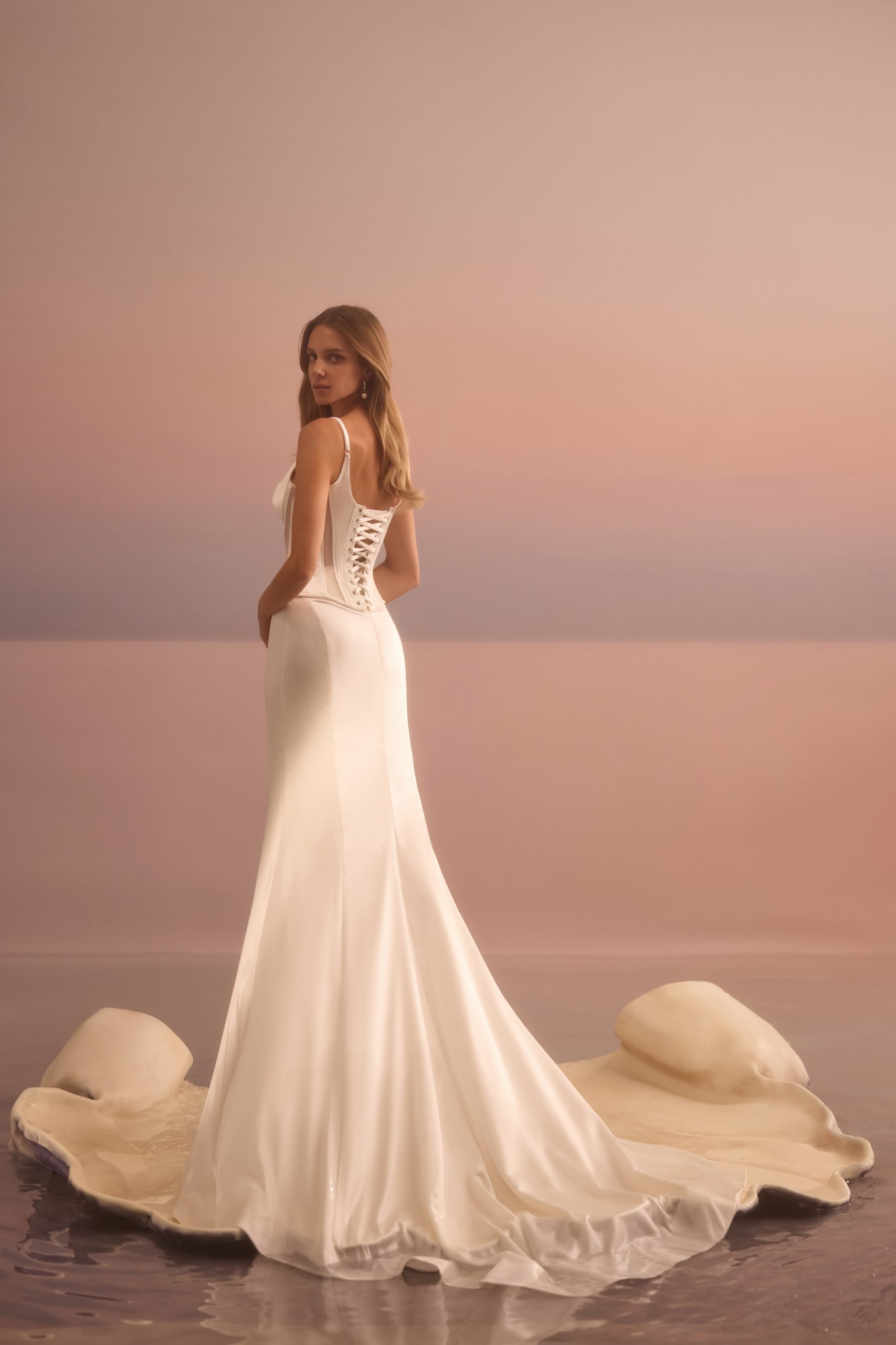 Un vestido de sirena minimalista está confeccionado en satén marfil. El corsé tiene tirantes finos y un espléndido escote. Está embellecido con inserciones de malla semi-transparentes. La parte posterior cuenta con un lazo. La falda contornea elegantemente la figura y fluye suavemente hacia una cola.